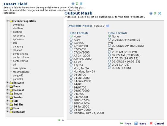 For example, contributors using a date field - one of the pre-defined Field Types - to include a Page Last Modified, Page Creation, or custom metadata date field, first select the field in the Insert Field dialog (as shown below) and click Next to display Output Mask options.