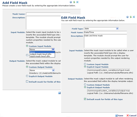 Use the Add Field Mask dialog to register a Field Mask for a Field Type. A Field Mask controls the rendering of an instance of a field within a Display Template or Rich Text Block. Contributors can "drop" fields into the rich text editor using the Insert Field icon and select a Field Mask to control how the field displays on page output.